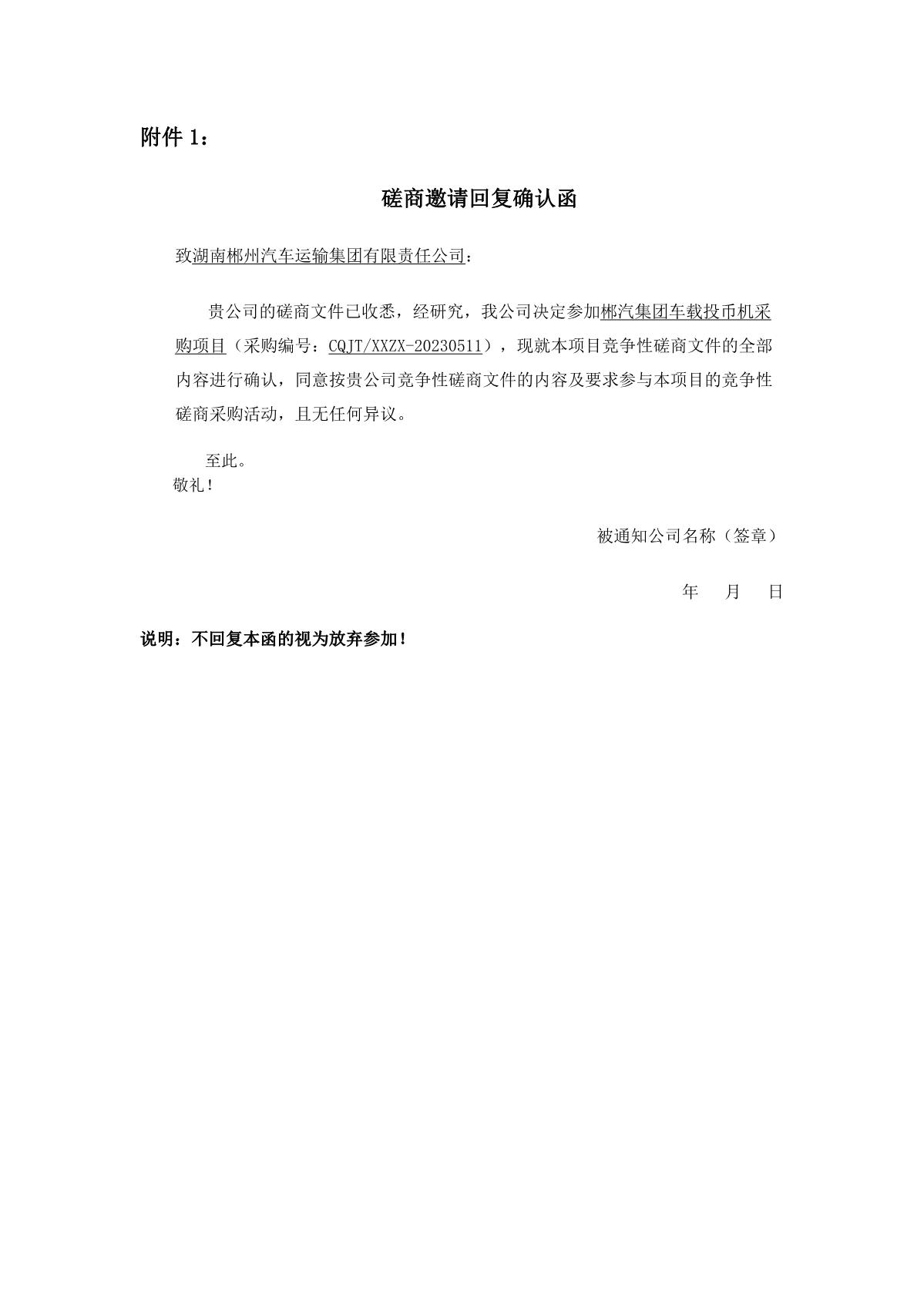 你單位收到磋商文件后,請于2023年5月26日17時前來函確認是否參加競爭性磋商采購活動。若未收到你方書面確認,將視為你方已放棄參加本項目競爭性蹉商采購活動(格式見附件1)。